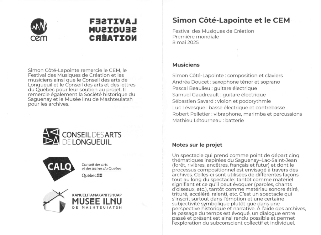 Un spectacle de musique mixte pour huit musiciens et séquence avec archives réalisé en mai 2025 en collaboration avec le Centre d’expérimentation musicale (CEM) au Saguenay.