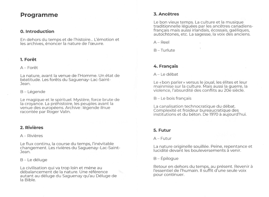 L’ensemble des compositions est envisagé comme un tout, un spectacle-concept articulé autour de cinq thématiques inspirées de Chicoutimi et du Saguenay : Forêt, Rivières, Ancêtres, Français et Futur. Le processus compositionnel est envisagé à travers des archives. Des archives sonores provenant de la Société historique du Saguenay et du Musée Ilnu de Mashteuiatsh ont été sélectionnées en lien avec les thématiques afin de constituer une banque de sons et de textures sonores pré-travaillées qui ont servi comme trames structurelles et intégrées aux compositions. Celles-ci sont utilisées de différentes façons tout au long du spectacle: tantôt comme matériel signifiant et ce qu’il peut évoquer (paroles, chants d’oiseaux, etc.), tantôt comme matériau sonore étire, trituré, accéléré, ralenti, etc. C’est un spectacle qui s’inscrit surtout dans l’émotion et une certaine subjectivité symbolique plutôt que dans une perspective historique et narrative. À l’aide des archives, le passage du temps est évoqué, un dialogue entre passé et présent est ainsi rendu possible et permet l’exploration du subconscient collectif et individuel.