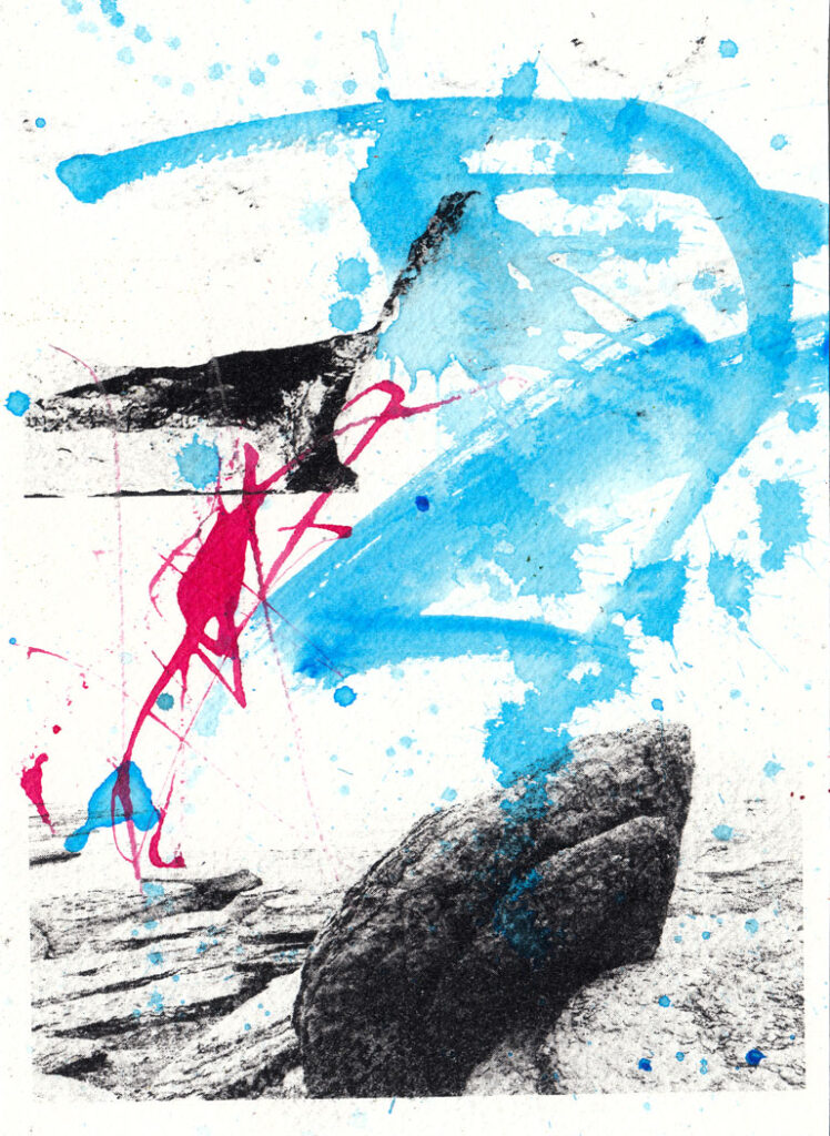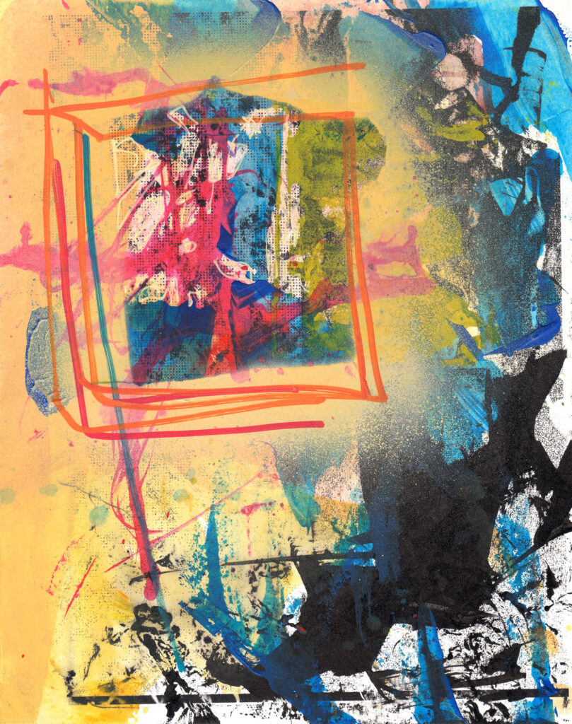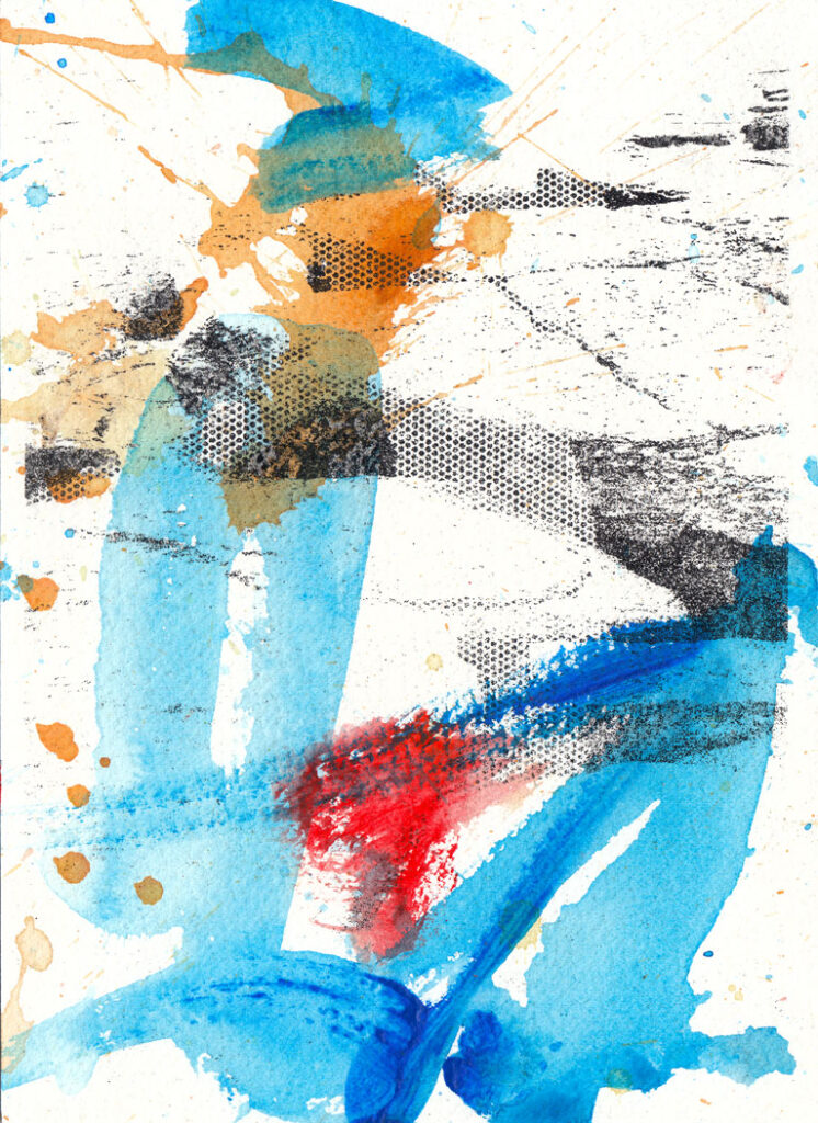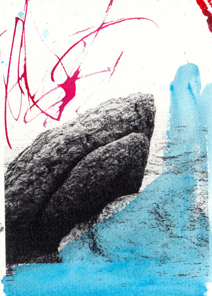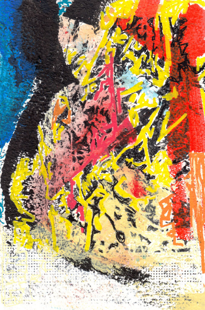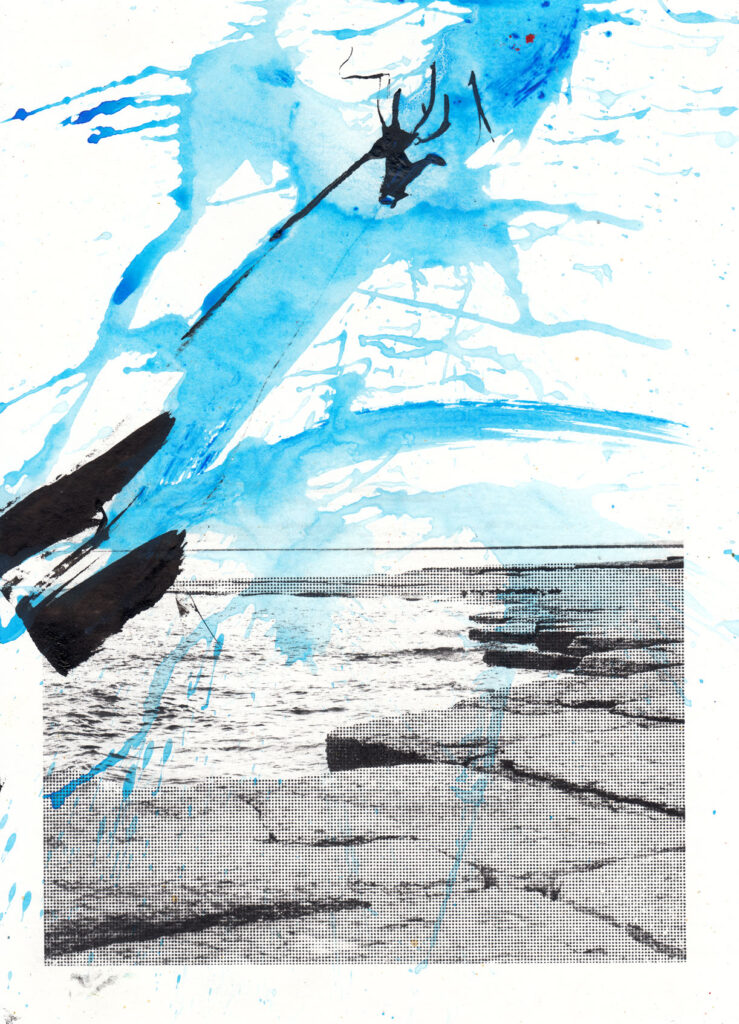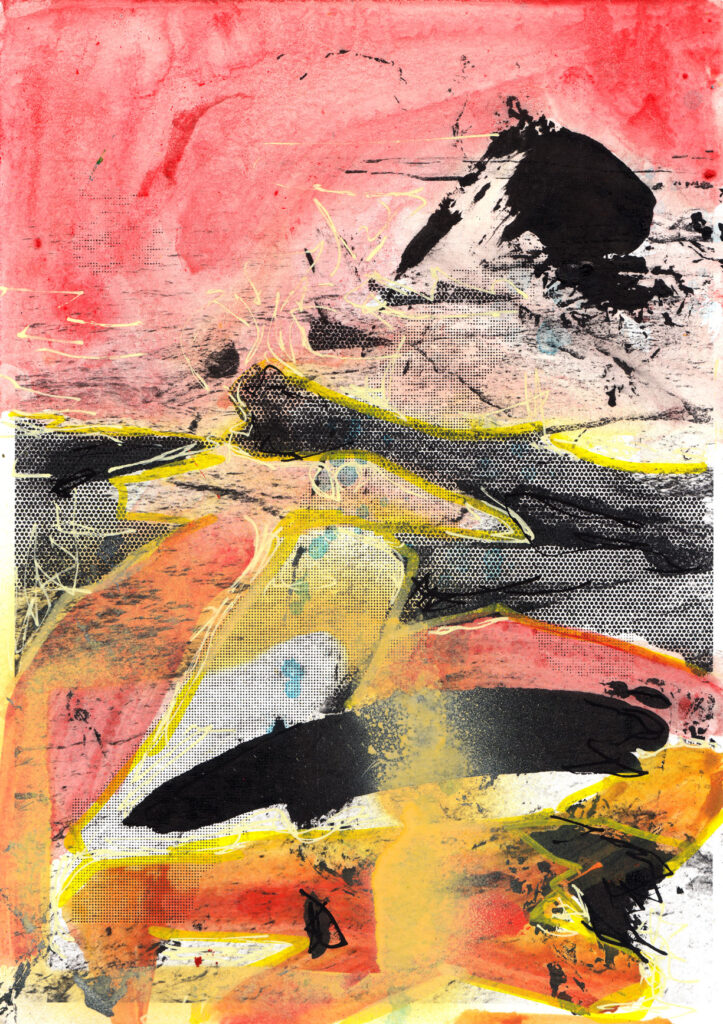 Cette série d’œuvres sur papier explore la rencontre entre deux forces : d’une part, la fixité des images imprimée en noir et blanc — qu’elles soient générées par intelligence artificielle ou photographiques — et d’autre part, la vitalité immédiate du geste pictural. En superposant encres, acrylique, fusain, pastel et traits spontanés au crayon sur ces images imprimées, j’ouvre un espace de friction entre mémoire et présence, entre surface et profondeur, entre figuration et abstraction. Chaque image devient un champ de tension : l’imprimé agit comme un cadre, un contexte, un passé reconstitué tandis que le geste pictural vient perturber, détourner ou révéler des zones de sens enfouies. Le noir et blanc de l’image imprimée évoque la distance, l’archive, la trace (accentuée par l’impression au laser qui rend visible le transfert numérique vers le support physique); le geste coloré, brut ou minimal, agit comme un contrepoint immédiat, intuitif, presque instinctif. Il redonne corps à l’image, lui insuffle un rythme, une présence humaine, imparfaite.